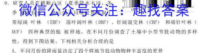 9.研究人员在横断山区(夏季降水丰沛,冬季雨水较少)高山的不同坡度处选取了常绿阔叶林(EBF)落叶阔叶林(DBF)、针阔混交林(CBF)和暗针叶林(DCF)四种典型的植被样地,在不同月份调查了土壤中小型节肢动物的多样性,得到下图结果。下列相关分析合理的是A.不同月份的降雨量决定了四个样地节肢动物物种丰富度的差异