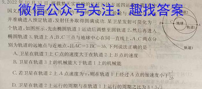 9.2022年10月31日,搭载梦天实验舱的长征五号B遥四运载火箭,在中国文昌航天发射场点火升空,约8分钟后,梦天实验舱与火箭成功分离并准确进入预定轨道,发射任务取得圆满成功.某卫星发射可简化为三个轨道,如图所示,先由椭圆轨道1运动后调整至圆轨道2,然后再进入椭圆轨道3..轨道上AB、C三点与地球中心在同一直线上.A.C两点分别为轨道的远地点与近地点,且AC=3BC=3b.下列说法正确的是A.卫星在轨道1上C点的速度大于在轨道2上B点的速度B.卫星在轨道3上的机械能大于轨道1上的机械能C.若卫星在轨道2上A点速度为,则在轨道1上经过A点的加速度小手v^22bD.卫星在轨道上运行的周期与在轨道1上运行的周期之比为8:33