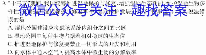 9.“十三五”期间,我国统筹推进湿地保护与修复,增强湿地生态功能,维护湿地生物多样性,全面提升湿地保护与修复水平,湿地保护发展进入了“快车道”。下列说法错误的是A.湿地公园建设应考虑该系统内组分之间的比例B.湿地公园中每种生物占据着相对稳定的生态位C.推进湿地保护与修复要禁止一切形式的开发和利用D.向水体中通入空气可提高水体中微生物的分解效率