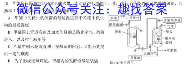 18.苹果是我国北方地区常见的水果,为对其进行深加工,某厂进行了苹果酒和苹果醋的研制,其基本工艺流程如下。下列说法正确的是()A.甲罐中的微生物所需的最适温度低于乙罐中微生物的最适温度B.甲罐顶上管道弯曲及加水的目的是防止空气、杂菌进入,以及排气减压等C.乙罐中刨木花既有利于发酵菌的附着,又能为其提供一定的碳源D.为了形成无氧环境,甲罐内的发酵液尽量装满