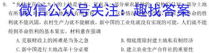 9.“乡村中百分之九十的土地是中农、贫农及一部分雇农耕种的,但他们只对一部分土地有所有权,对大部分土地则没有所有权。……这种情况如果不改变,中国人民革命的胜利就不能巩固,农村生产力就不能解放,新中国的工业化就没有实现的可能,人们就不能得到革命胜利的基本果实。材料意在强调A.克服财政上的困难是当务之急B.彻底废除封建土地私有制经济C.新中国进行十分必要D.建立农业生产合作社的重要性