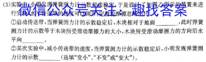 (3)实验中,小明发现弹簧测力计示数很难稳定,于是设计了如图乙所示的装置来进行实验,水平传送带的速度可以调节,定滑轮摩擦忽略不计。①启动传送带,当弹簧测力计的示数稳定后,木块相对于地面,此时弹簧测力计的示数等于木块所受滑动摩擦力的大小,木块所受滑动摩擦力的方向沿水平向。②某次实验中,减小传送带的速度,当弹簧测力计的示数稳定后,小明发现弹簧测力计的示数(选填“变小”、“不变”或“变大”)。
