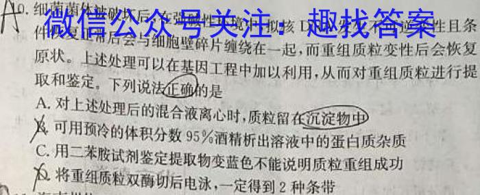 0.细菌菌体被破坏后,在强碱性环境中,拟核DNA发生不可逆变性且条DNA件恢复正常后会与细胞壁碎片缠绕在一起,而重组质粒变性后会恢复原状。上述处理可以在基因工程中加以利用,从而对重组质粒进行提取和鉴定,下列说法正法正确的是是A.对上述处理后的混合液离心时,质粒留在沉淀物中及可用预冷的体积分数95%酒精析出溶液中的蛋白质杂质C.用二苯胺试剂鉴定提取物变蓝色不能说明质粒重组成功将重组质粒双酶切后电泳,一定得到2种条带
