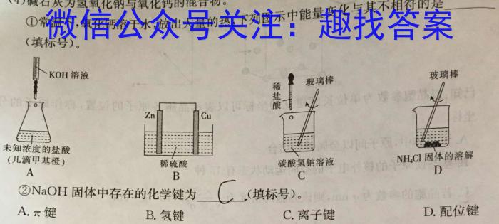 (4)碱石灰为氢氧化钠与氧化钙的混合物。①常温下,氧化钙溶于水,放出大量的热,下列图示中能量变化与其不相符的是(填标号)。KOH溶液玻璃棒玻璃棒稀盐o酸Cu未知浓度的盐酸(几滴甲基橙)NH4Cl固体的溶解稀硫酸碳酸氢钠溶液DBC②NaOH固体中存在的化学键为C(填标号)。D.配位键A.π键B.氢键C.离子键
