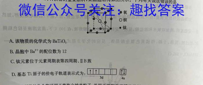 9.压电材料是制作压力转换器的重要原料,某晶胞结构如图所示。下列有关说法错误的是·钛A.该物质的化学式为BaTiO3B.晶胞中Ba^2+的配位数为12C.钛元素位于元素周期表第四周期、ⅡB族D.基态Ti原子的价电子轨道表示式为: