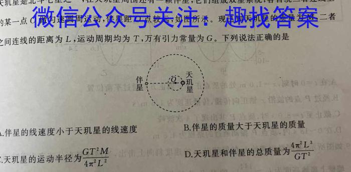 5.天现星是北斗七星之一,在天现星周围还有一颗伴星,它们组成双星系统,各自绕二者连线上的某一点O做匀速圆周运动,伴星距O点较远,如图所示。现已知天现星的质量为M一之间连线的距离为L,运动周期均为T,万有引力常量为G,下列说法正确的是星A.伴星的线速度小于天玑星的线速度B.伴星的质量大于天玑星的质量C.天星的运动半径为GT^2M4^2D.天玑星和伴星的总质量为4^2L^3GT^2