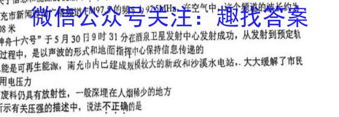 7.下列关于信息和能源的说法中不正确的是第6题图A.南充市新闻咨询广播频道FM97.5的频力97.5MHz.在空气中,这个频道的波长约为97.5MHz,3.08米B.“神舟十六号”于5月30日9时31分在酒泉卫星发射中心发射成功,从发射到预定道过程中,是以声波的形式和地面指挥中心保持信息传递的C.水能是可再生能,南允巾内已定成玩慢大的新政和沙溪水电站,大大缓解了市民的用电压力