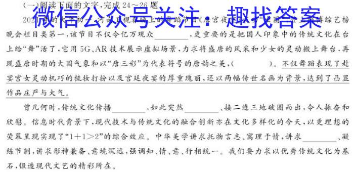 (一)阅读下面的文字,完成24~26题2021年的大年初一,河南卫视春晚上的舞蹈节目《唐宫夜宴》成功“出圈”,登上微博综艺榜晚会栏目类第一,该节目不仅令亿万观众,更重要的是把国人印象中的传统文化在台上给“舞”活了,它用5G、AR技术展示虚拟场景,力求将盛唐的风采和少女的灵动搬上舞台,再现盛唐时期的大国气象和以“唐三彩”为代表符号的唐韵之美,()。不仅舞蹈表现了赴宴宫女灵动机巧的梳妆打扮以及宫廷夜宴的厚重瑰丽,还以两幅传世名画为背景,达到了凸显作品庄严与大气。曾几何时,传统文化传播,如此突然、接二连三地破圈而出,令人振奋和欣慰。信息时代背景下,现代技术与传统文化的融合创新亦在文化多样化的今天,以更理想的荧幕呈现实现了““1+1>2”的综合效应。中华美学讲求托物言志、寓理于情,讲求、凝练节制,讲求形神兼备、意境深远,强调知、情、意、行相统一。我们要力求以优秀传统文化为基石,锻造现代文艺的精彩所在。