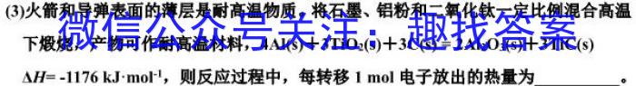 (3)火箭和导弹表面的薄层是耐高温物质。将石墨、铝粉和二氧化钛一定比例混合高温下煅烧,产物可作耐高温材料,4Al(s)+3TiO2(s)+3C(s)=2Al2O3(s)+3TiC(s)H=-1176kJmol^-1,,则反应过程中,每转移1mol电子放出的热量为。
