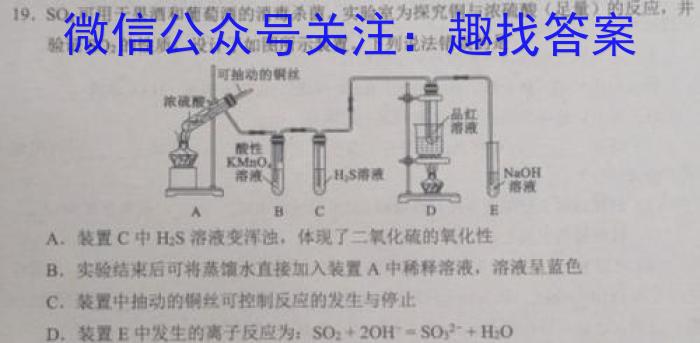 19.SO2可用于果酒和葡萄酒的消毒杀菌,实验室为探究铜与浓硫酸(足量)的反应,并验证SO2的性质,设计了如图所示装置,下列说法错误的是A.装置C中H2S溶液变浑浊,体现了二氧化硫的氧化性B.实验结束后可将蒸馏水直接加入装置A中稀释溶液,溶液呈蓝色C.装置中抽动的铜丝可控制反应的发生与停止D.装置E中发生的离子反应为:SO2+2OH^-=SO3^2-+H2O