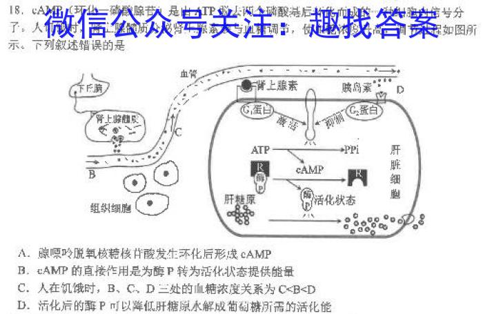 18.cAMP(环化一磷酸腺苷)是出ATP脱去两个磷酸基后环化而成的一种细胞内信号分了。人饥饿时,肾上腺髓质分泌肾上腺参与血糖调节,使血糖浓度升高,调节过程如图所示、下列叙述错误的是A.腺嘌呤脱氧核糖核苷酸发生环化后形成CAMPB.cAMP的直接作用是为酶P转为活化状态提供能量C.人在饥饿时,B、C、D三处的血糖浓度关系为C<B<DD.活化后的酶P可以降低肝糖原水解成葡萄糖所盂的活化能