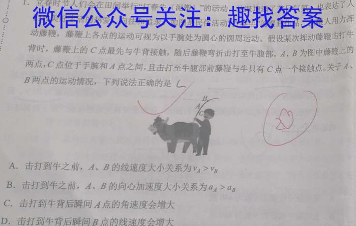 1.立春时节人们会在田间举行“打春牛(泥塑)”的活动,这既增添了节日气氛,也表达了人们对美好生活的热爱、向往和追求。如图是民俗活动“打春牛”的漫画作品,执鞭人用力挥动藤鞭,藤鞭上各点的运动可视为以手腕处为圆心的圆周运动。假设某次挥动藤鞭击打牛C背时,藤鞭上的C点最先与牛背接触,随后藤鞭弯折击打至牛腹部。A、B为图中藤鞭上的A、B两点,C点位于手腕和A点之间,且击打至牛腹部前藤鞭与牛只有C点一个接触点。关于AB两点的运动情况,下列说法正确的是CBA.击打到牛之前,A,,B的线速度大小关系为vA>vBB.击打到牛之前,A1、B的向心加速度大小关系为aA>aBC.击打到牛背后瞬间A点的角速度会增大击打到牛背后瞬间B点的线速度会增大