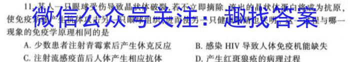 11.某人一只眼球受伤导致晶状体破裂,若不立即摘除,流出的晶状体蛋白将成为抗原,使免疫系统产生抗体攻击另一只眼球组织,进而使另一只健康眼睛也失明。这一过程与哪一现象的免疫学原理相同的是A.少数患者注射青霉素后产生休克反应B.感染HIV导致人体免疫机能缺失C.注射流感疫苗后人体产生相应抗体D.产生红斑狼疮的病理过程