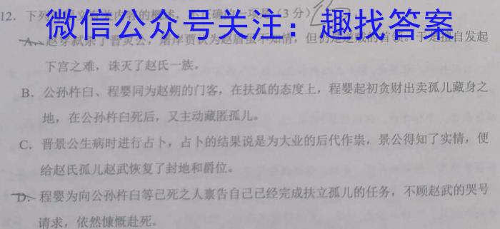 D.活,“使……活”的意思,与《鸿门宴》中“项伯杀人,臣活之”的“活”意思相同。12.下列对原文有关内容的概述,不正确的一项是(3分3A赵穿弑杀了晋灵公,屠岸贾认为赵盾虽不知情,但仍是逆贼的首领。于是擅自发起下宫之难,诛灭了赵氏一族。B.公孙杵白、程婴同为赵朔的门客,在扶孤的态度上,程婴起初贪财出卖孤儿藏身之地,在公孙杵白死后,又主动藏匿孤儿。C.晋景公生病时进行占卜,占卜的结果说是为大业的后代作崇,景公得知了实情,便给赵氏孤儿赵武恢复了封地和爵位。D.程婴为向公孙杵白等已死之人禀告自己已经完成扶立孤儿的任务,不顾赵武的哭号请求,依然慷慨赴死。(1)《李凭箜篌引》中“,”两句运用了通感的艺术手法直接描慕音乐。