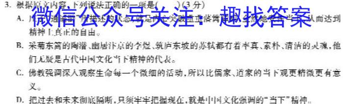 3.根据原文内容,下列说法正确的一项是()(3分)A.子“逍遥游”所描述的状态,就是内心突破重重落篱障碎,全然地安住当下,从而达到精神上真正的自出。B.采菊东筒的陶潜、幽居汴京的李烂、筑庐东坡的苏轼都有着真、索朴、清洁的灵魂,他们无疑是占代中国文化当下精神的代表。C.佛教强调深人观察生命每一个微细的活动,所以比儒家、道家的当下观更精微更有意义。D.把过去和未来彻底隔晰,只须牢牢把握现在,就是中国文化强调的“当下”精神.