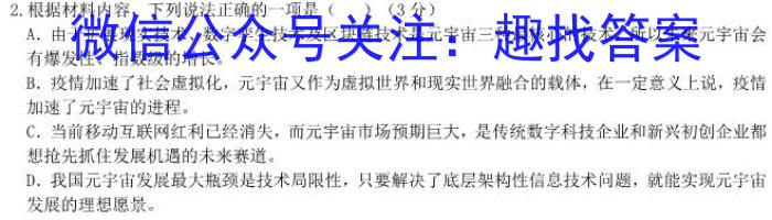 2.根据材料内容,下列说法正确的一项是()(3分)A.由于扩展现实技术、数字孪生技术及区块链技术是元宇宙三种最核心的技术,所以未来元宇宙会有爆发性、指数级的增长。B.**加速了社会虚拟化,元宇宙又作为虚拟世界和现实世界融合的载体,在一定意义上说,**加速了元宇宙的进程。C.当前移动互联网红利已经消失,而元宇宙市场预期巨大,是传统数字科技企业和新兴初创企业都想抢先抓住发展机遇的未来赛道。D.我国元宇宙发展最大瓶颈是技术局限性,只要解决了底层架构性信息技术问题,就能实现元宇宙发展的理想愿景。