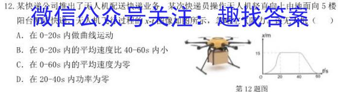 12.某快递公司推出了无人机配送快递业务。某次快递员操作无人机竖直向上由地面向5楼阳台配送快递,无人机飞行过程的x-t图像如图所示,忽略空气阻力。该无人机()A.在0-20s内做曲线运动B.在0-20s内的平均速度比40-60s内小C.在0-60s内的平均速度为零D.在20-40s内功率为零
