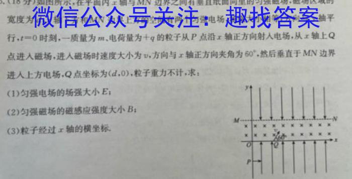15.(18分)如图所示,在平面内x轴与MN边界之间有垂直纸面向里的匀强磁场,磁场区域的宽度为d,x轴下方和MN边界上方的空间有两个匀强电场,场强大小相等,方向与y抽平行,t=0时刻,一质量为m,电荷量为+q的粒子从P点沿x轴正方向射入电场,从x轴上Q点进人磁场,进人磁场时速度大小为v,方向与x轴正方向夹角为60^,,然后垂直于MN边界进人上方电场,Q点坐标为(d,0),粒子重力不计,求;(1)匀强电场的场强大小E;(2)匀强磁场的磁感应强度大小B;(3)粒子经过x轴的横坐标.