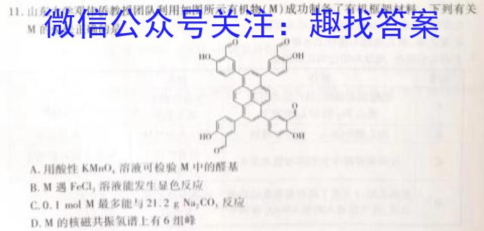 11.山东大学邓伟侨教授团队利用如图所示有机物(M)成功制备了有机框架材料。下列有关M的说法正确的是A.用酸性KMnO4溶液可检验M中的醛基B.M遇FeCl3溶液能发生显色反应C.0.1molM1最多能与21.2gNa2CO3反应D.M的核磁共振氢谱上有组峰