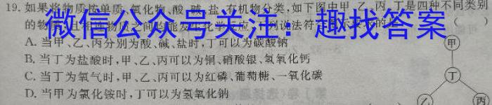 19.如果将物质按单质、氧化物、酸、碱、盐、有机物分类,如下图中甲、乙、丙、丁是四种不同类别的物质,且相连物质之间均能发生化学反应,下列说法符合图示要求的是()A.当甲、乙、丙分别为酸、碱、盐时,丁可以为碳酸钠B.当丁为盐酸时,甲、乙、丙可以为铜、硝酸银、氢氧化钙C.当丁为氧气时,甲、乙、丙可以为红磷、葡萄糖、一氧化碳D.当甲为氯化铵时,丁可以为氢氧化钠甲丙)