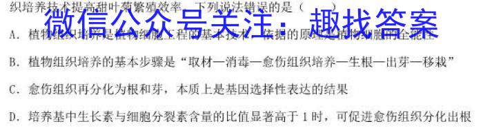 织培养技术提高甜叶菊繁殖效率。下列说法错误的是()A.植物组织培养是植物细胞工程的基本技术,依据的原理是植物细胞的全能性B.植物组织培养的基本步骤是“取材一消毒一愈伤组织培养一生根一出芽一移栽”C.愈伤组织再分化为根和芽,本质上是基因选择性表达的结果D.培养基中生长素与细胞分裂素含量的比值显著高于1时,可促进愈伤组织分化出根