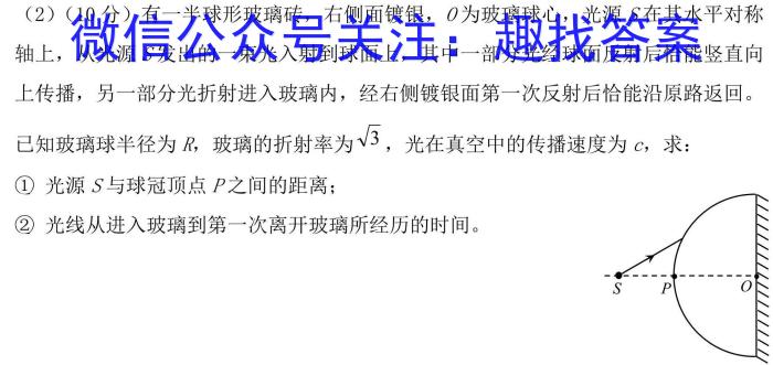 (2)(10分)有一半球形玻璃砖,右侧面镀银,0为玻璃球心,光源S在其水平对称轴上,从光源S发出的一束光入射到球面上,其中一部分光经球面反射后恰能竖直向上传播,另一部分光折射进入玻璃内,经右侧镀银面第一次反射后恰能沿原路返回。已知玻璃球半径为R,玻璃的折射率为3,,光在真空中的传播速度为c,求:①光源S与球冠顶点P之间的距离;②光线从进入玻璃到第一次离开玻璃所经历的时间。