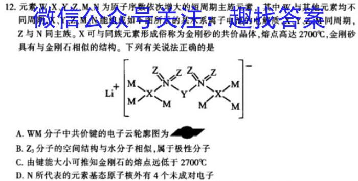 12.元素W、X、Y、Z、M、N为原子序数依次增大的短周期主族元素,其中W与其他元素均不同周期,X、Y、Z、M、N能组成如下图所示的某水系离子电池的电解质,X、Y、Z、M同周期,Z与N同主族。X可与同族元素形成俗称为金刚砂的共价晶体,熔点高达2700^C,,金刚砂具有与金刚石相似的结构。下列有关说法正确的是A.WM分子中共价键的电子云轮廓图为B.Z3分子的空间结构与水分子相似,属于极性分子C.由键能大小可推知金刚石的熔点远低于2700^CD.N所代表的元素基态原子核外有4个未成对电子