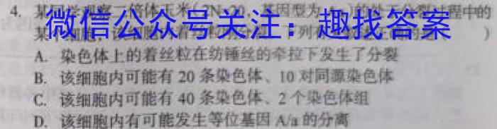 4.某同学观察二倍体玉米(2N=20,,基因型为Aa)的处于分裂过程中的某个细胞,该细胞内着丝粒刚分裂。下列有关叙述正确的是()A.染色体上的着丝粒在纺锤丝的牵拉下发生了分裂B.该细胞内可能有20条染色体、10对同源染色体C.该细胞内可能有40条染色体、2个染色体组组D.该细胞内有可能发生等位基因的分离