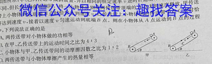 D.从小球A接触弹簧到弹簧再次恢复原长,弹簧对小球A、B的冲量相同如图所示,甲、乙两传送带倾斜放置,并以相同的恒定速率v逆时针运动,两传送带粗糙程度不不同,但长度、倾角均相同。将一小物体分别从两传送带顶端的A点无初速度释放,甲传送带上小物体到达底端B点时恰好达到速度v;乙传送带上小物体到达传送带中点C点时恰v;好达到速度v,接着以速度v匀速运动到底端B点。则在小物体从A点运动到B点的过程中,下列说法正确的是A.两传送带对小物体做的功相等BB.在甲、乙传送带上的运动时间之比为4:3C.小物体与甲、乙传送带间的动摩擦因数之比为1:2D.两传送带与小物体摩擦产生的热量相等ACBB0θ甲乙