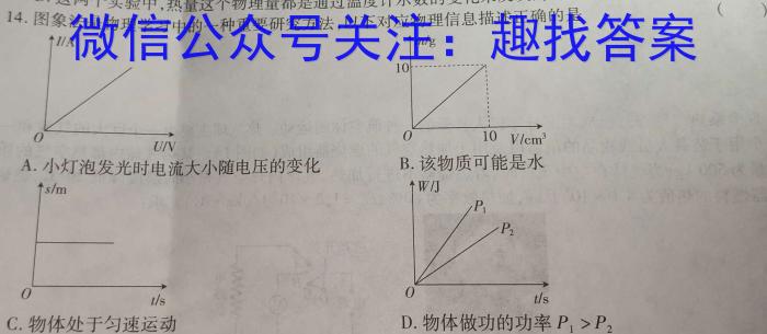 ()14.图象法是物理学*中的一种重要研究方法,以下对应物理信息描述正确的是A.小灯泡发光时电流大小随电压的变化B.该物质可能是水P1>P2