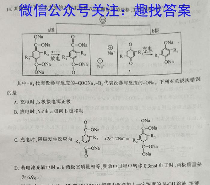 14.某钠离子可充电电池的工作主要靠Na在两极间的迁移,工作原理如图:Na^+-R1-COONa,-R2其中-R代表没参与反应的-COONa,-R.代表没参与反应的-ONa。下列有关说法错误的是A.充电时,b极接电源正极B.放电时,Na^+由a极向b极移动ONaC.充电时,阴极发生反应为R2+2e^-+2Na^+=R2R2ONaNaONaD.若电池充满电时a、b两极室质量相等,则放电过程中转移0.3mol电子时,两极质量差为6.9g