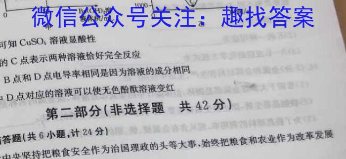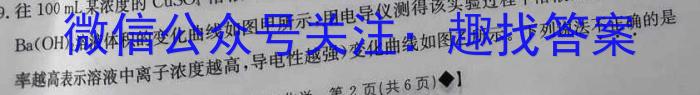 9.往100mL某浓度的CuSO4溶液中逐滴加人某浓度的Ba(OH)2溶液,溶液的pH随滴人Ba(OH)2溶液体积的变化曲线如图甲所示,用电导仪测得该实验过程中溶液的电导率(电导率越高表示溶液中离子浓度越高,导电性越强)变化曲线如图乙所示。下列说法不正确的是pH导率1400079000AA7000BBa(OH)2溶100液体积/mL时间/sA.由图甲可知CuSO溶液显酸性A.CuSO4乙CB.图乙中的C点表示两种溶液恰好完全反应C.图乙中B点和D点电导率相同是因为溶液的成分相同D.图乙中D点对应的溶液可以使无色酚酞溶液变红