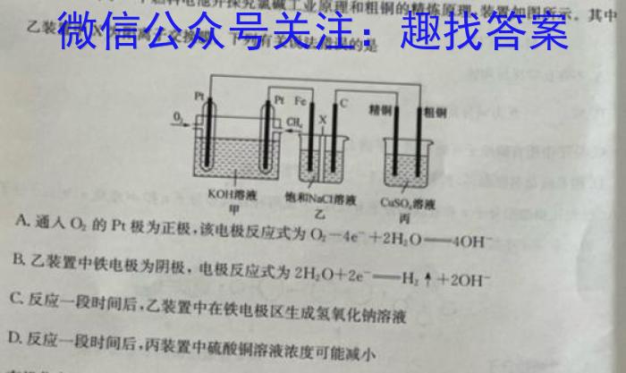 13.某同学设计了一个燃料电池并探究氯碱工业原理和粗铜的精炼原理,装置如图所示,其中乙装置中X为阳离子交换膜。下列有关说法错误的是FecKOH溶液1溶液甲乙A.通人O2的Pt极为正极,该电极反应式为O2-4e^-+2H2O4OH^-B.乙装置中铁电极为阴极,电极反应式为2H2O+2e^-H2+2OH^-C.反应一段时间后,乙装置中在铁电极区生成氢氧化钠溶液D.反应一段时间后,丙装置中硫酸铜溶液浓度可能减小