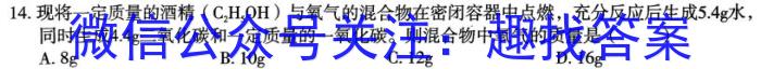 14.现将一定质量的酒精(C2H5OH)与氧气的混合物在密闭容器中点燃,充分反应后生成5.4g水,同时生成4.4g二氧化碳和一定质量的一氧化碳。则混合物中氧气的质量是()A.8gB.10gC.12gD.16g