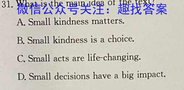 31.What is the main idea of the text?A. Small kindness matters.B. Small kindness is a choice.C. Small acts are life-changing.D. Small decisions have a big impact.
