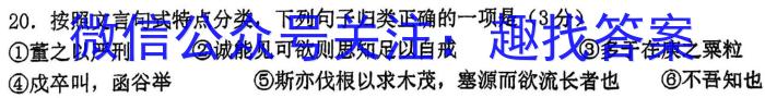 20.按照文言句式特点分类,下列句子归类正确的一项是(3分)①董之以严刑②诚能见可欲则思知足以自戒③多于在庾之粟粒④戍卒叫,函谷举⑤斯亦伐根以求木茂,塞源而欲流长者也⑥不吾知也