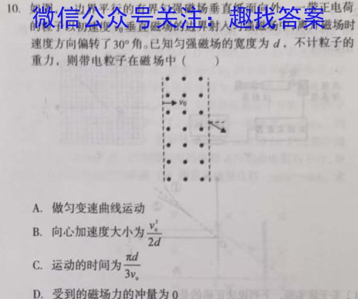 10.如图,一边界平行的有界匀强磁场垂直纸面向外,一带正电荷的粒子以初速度v0垂直磁场的边界射入匀强磁场中,离开磁场时速度方向偏转了30^角。已知匀强磁场的宽度为d,,不计粒子的同偏转重力,则带电粒子在磁场中()A.做匀变速曲线运动B.向心加速度大小为v0^22dC.运动的时间为d3v0D.受到的磁场力的冲量为0