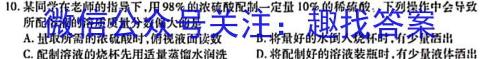 10.某同学在老师的指导下,用98%的浓硫酸配制一定量10%的稀硫酸:下列操作中会导致所配溶液的溶质质量分数偏大的是A.量取所需的浓硫酸时,俯视液面读数B.将量好的水倒入烧杯时,有少量洒出C.配制溶液的烧杯先用适量蒸馏水润洗D.将配制好的溶液装瓶时,有少量液体洒出