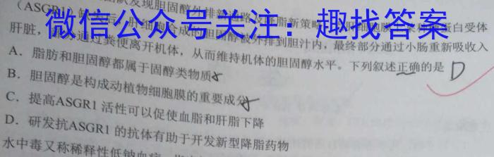 肝,(ASGR1)缺失后,肝细胞合成的胆固醇被外排到胆汁内,最终部分通过小肠重新吸收入肝脏,部分通过粪便离开机体,从而维持机体的胆固醇水平。下列叙述正确的是A.脂肪和胆固醇都属于固醇类物质之DB.胆固醇是构成动植物细胞膜的重要成C.提高ASGR1成分分活性可以促使血脂和肝脂下降ASGR1水D.研发抗ASGR1的抗体有助于开发新型降脂药物
