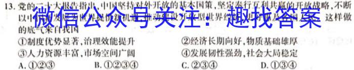 13.报告指出,中国坚持对外开放的基本国策,坚定奉行互利共赢的开放战略,不断以中国新发展为世界提供新机遇,推动建设开放型世界经济,更好惠及各国人民。这样做的底气来自我国①制度优势显著,治理效能提升②经济长期向好,物质基础雄厚③人力资源丰富,市场空间广阔④发展韧性强劲,社会大局稳定A.①②③B.①②③④C.②③④D.①③④
