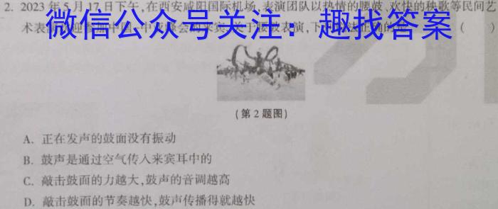 2.2023年5月17日下午,在西安咸阳国际机场,表演团队以热情的腰鼓、欢快的秧歌等民间艺术表演欢迎参加中国-中亚峰会的来宾,关于腰鼓表演,下列说法正确的是()(第2题图)A.正在发声的鼓面没有振动B.鼓声是通过空气传入来宾耳中的C.敲击鼓面的力越大,鼓声的音调越高D.敲击鼓面的节奏越快,鼓声传播得就越快