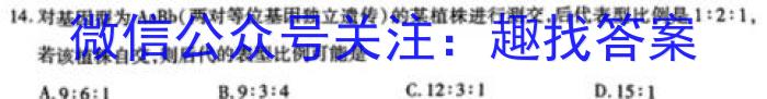 14.对基因型为AaBb(两对等位基因独立遗传)的某植株进行测交,后代表型比例是1:2:1,若该植株自交,则后代的表型比例可能是A.9:6:1B.9:3:4C.12:3:1D.15:1