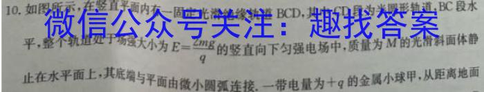 10.如图所示,在竖直平面内有一固定光滑绝缘轨道BCD,其中CD段为半圆形轨道,BC段水平,整个轨道处于场强大小为E=2mgq的竖直向下匀强电场中,质量为M的光滑斜面体静止在水平面上,其底端与平面由微小圆弧连接.一带电量为+q+q的金属小球甲,从距离地面【232756D【高二