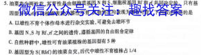 5.油离花为雨性花,其育性是由船胞质基因N和S、胞核基因1和r共同决定的。只有基四型为:的植橡表现为培性不有,其他情况均表现为雄性可肯。下列叙述误的是A.以性不育个体作母本进行杂交实验,可免去堆环节B.基因N、5与[之间的遗传,新基因的自由组合定律C.白然种群中,堆性可育油菜植株的基因型有5种D.基因泰为的油菜白交,后代中堆性不育植株占1/4