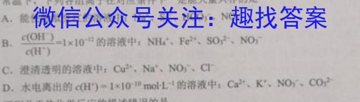 6.常温下,下列各组离子在对应条件下一定能大量共存的是A.能使酚酞变红的溶液中:Na^+、S^2-、HCO3^-、NO3^-B.c(OH^-)c(H^-)=110^-12的溶液中:NH4^+、Fe^2+、SO3^2-、NO3^-C.澄清透明的溶液中:Cu^2+、Na^+、NO3^-、Cl^-D.水电离出的c(H^+)=110^-10molL^-1的溶液中:Ca^2+、K^+、NO3^-、CO3^2-