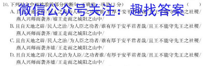 10.下列对文中画波浪线部分的断句,正确的一项是(3分)()A.且自天地之辟/民人之治为人臣/之功者谁/有厚于安平君者哉/且王不能守先王之社稷/燕人兴师而袭齐/墟王走而之城阳之山中/B.且自天地之辟/民人之治/为人臣之功者/谁有厚于安平君者哉/且王不能守先王之社稷/燕人兴师而袭齐/墟王走而之城阳之山中/C.且自天地之辟/民人之治/为人臣之功者/谁有厚于安平君者哉/且王不能守先王之社稷/燕人兴师而袭齐墟/王走而之城阳之山中/D.且自天地之辟/民人之治为人臣/之功者谁/有厚于安平君者哉/且王不能守先王之社稷/燕人兴师而袭齐墟/王走而之城阳之山中/