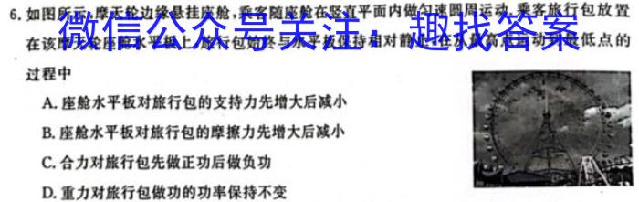 6.如图所示,摩天轮边缘悬挂座舱,乘客随座舱在竖直平面内做匀速圆周运动.乘客旅行包放置在该摩天轮座舱水平板上,旅行包始终与水平板保持相对静止,在从最高点运动到最低点的过程中A.座舱水平板对旅行包的支持力先增大后减小B.座舱水平板对旅行包的摩擦力先增大后减小C.合力对旅行包先做正功后做负功D.重力对旅行包做功的功率保持不变