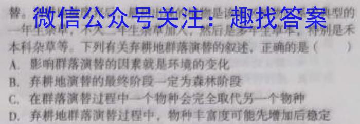 11.弃耕地演替又称撂荒地演替,是指耕地弃耕撂荒后所发生的次生演替。当耕地被废弃后,最初出现的植物是该地区植物区系中典型的一年生杂草,不久二年生杂草加人,然后是多年生草本,特别是禾本科杂草等。下列有关弃耕地群落演替的叙述,正确的是()A.影响群落演替的因素就是环境的变化B.弃耕地演替的最终阶段一定为森林阶段C.在群落演替过程中一个物种会完全取代另一个物种D.弃耕地群落演替过程中,物种丰富度可能先增加后稳定