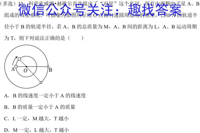 (多选)13.科学家威廉•赫歇尔首次提出了“双星”这个名词。现有由两颗中子星A、B组成的双星系统,可抽象为如图所示绕O点做匀速圆周运动的模型,已知A的轨道半径小于B的轨道半径,若A、B的总质量为M,A、B间的距离为L,A、B运动周期为T,则下列说法正确的是()A.B的线速度一定小于A的线速度B.B的质量一定小于A的质量C.L一定,M越大,T越小D.M一定,L越大,T越小