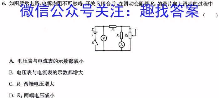 6.如图所示电路,电源内阻不可忽略.开关S闭合后,在滑动变阻器R0的滑片向上滑动的过程中()A.电压表与电流表的示数都减小B.电压表与电流表的示数都增大C.R1两端电压增大D.R2两端电压减小
